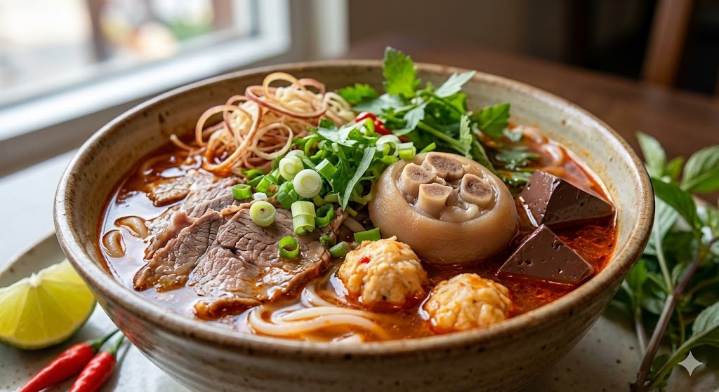 Bún bò Huế trọn vị với đầy đủ bắp hoa, giò heo, chả cua, tiết